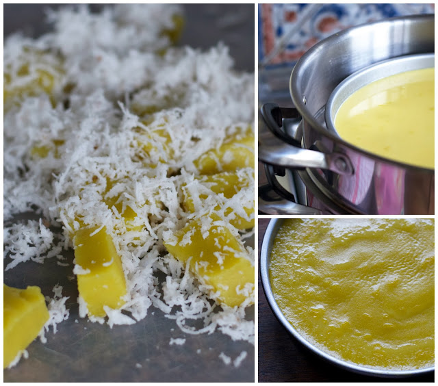 Cube the steamed agar then roll in steamed grated coconut, ready to serve.